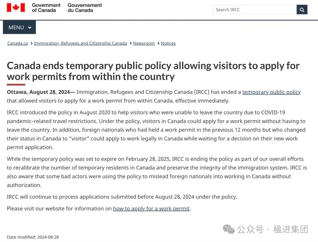 近期加拿大移民局大动作频繁,全面收紧留学移民政策口子的风向明显。昨天又搞了个“大活儿”!据加拿大移民局消息,8月28日起,在加拿大持访客签证的临时居民将不再被允许在加拿大境内申请工作许可证!该政策原本计划于2025年2月28日到期,但移民局决定提前终止。