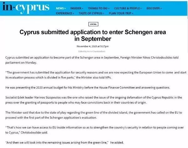 2019年11月4日,塞浦路斯当地发行量最大的英文报纸,《塞浦路斯邮报》报导:塞浦路斯已于9月提交了加入申根地区的申请。