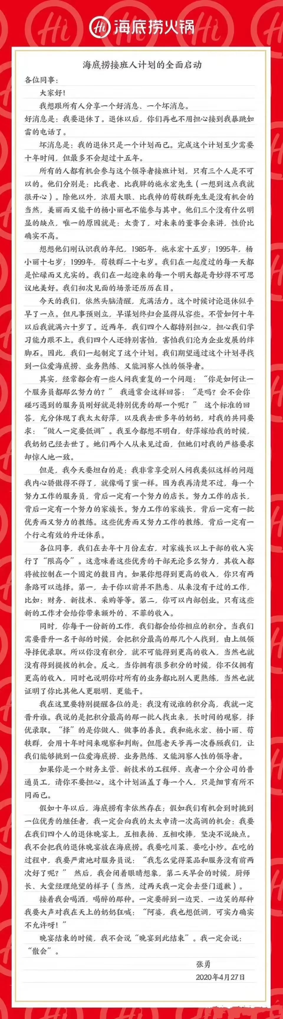 继瑞幸咖啡造假事件、李国庆俞渝夫妇大打出手之后,4月28日,海底捞创始人张勇发布员工内部信,标题为“海底捞接班人计划的全面启动”。