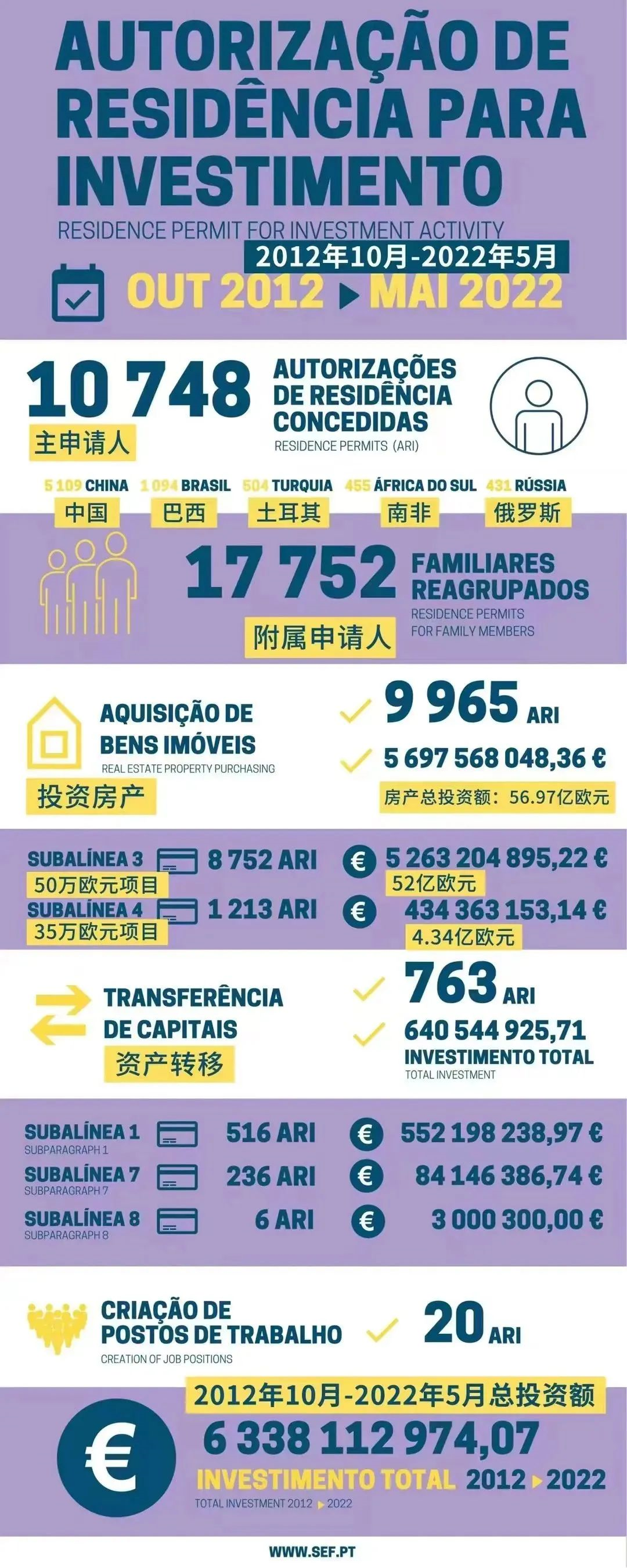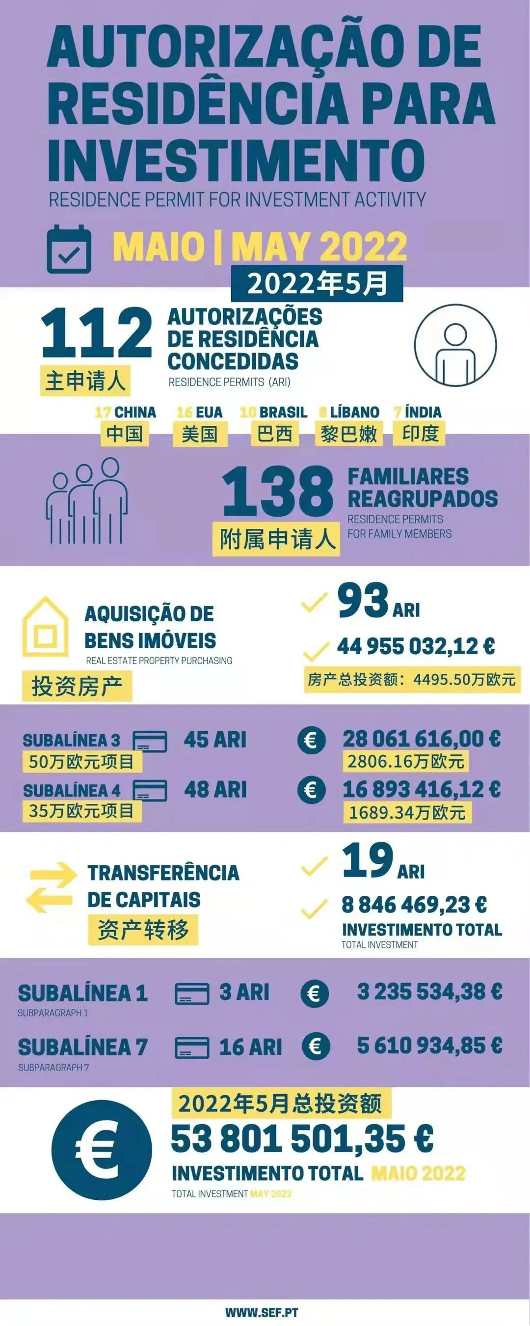 根据葡萄牙移民局SEF的最新数据,2022年5月, 黄金签证投资额较去年同期增长94%,达到5380万欧元 。