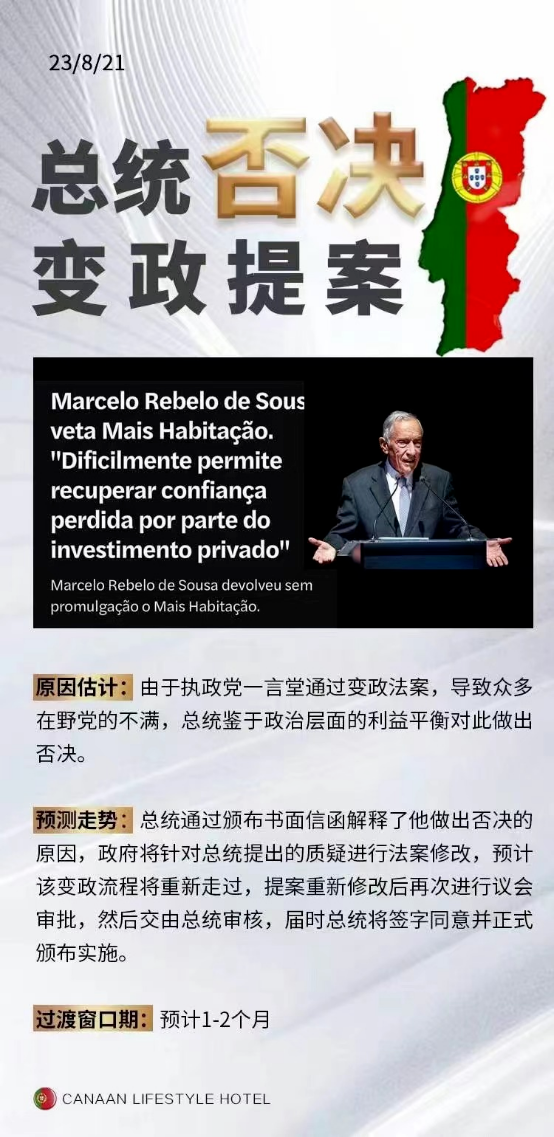葡萄牙政策最新新闻,当地时间2023年8月21日上午,葡萄牙总统马塞洛宣布否决新住房法案。