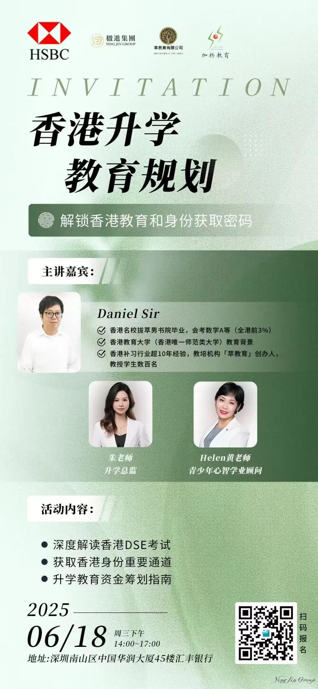 6月18日,楹进集团深圳公司联合汇丰银行深圳湾分行,将举办《香港升学与教育规划》活动,深度剖析香港教育生态,为不同家庭提供定制化方案。无论您是为孩子教育提前布局,还是寻求多元化发展路径,这都是一个获取前沿信息、对接优质资源的好机会。